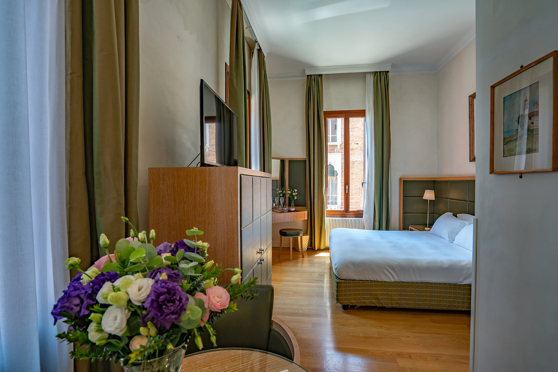 Double Canal View: größere Zimmer mit Panoramablick auf den Kanal, perfekt für Gäste, die die Magie der Stadt voll genießen und die vorbeigleitenden Gondeln von ihrem Fenster aus beobachten möchten.