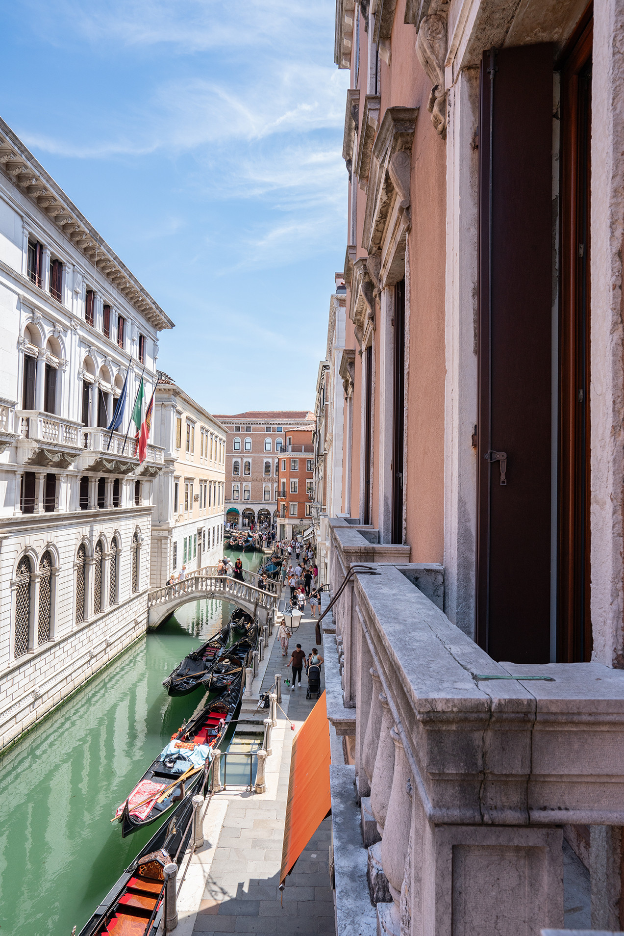 Die Unterkunft blickt auf das malerische Bacino Orseolo, einen charmanten Kanal, von dem die Gondeln zu ihren Fahrten ablegen und an dem sie nachts vertäut werden – ein typisch venezianisches Ambiente.