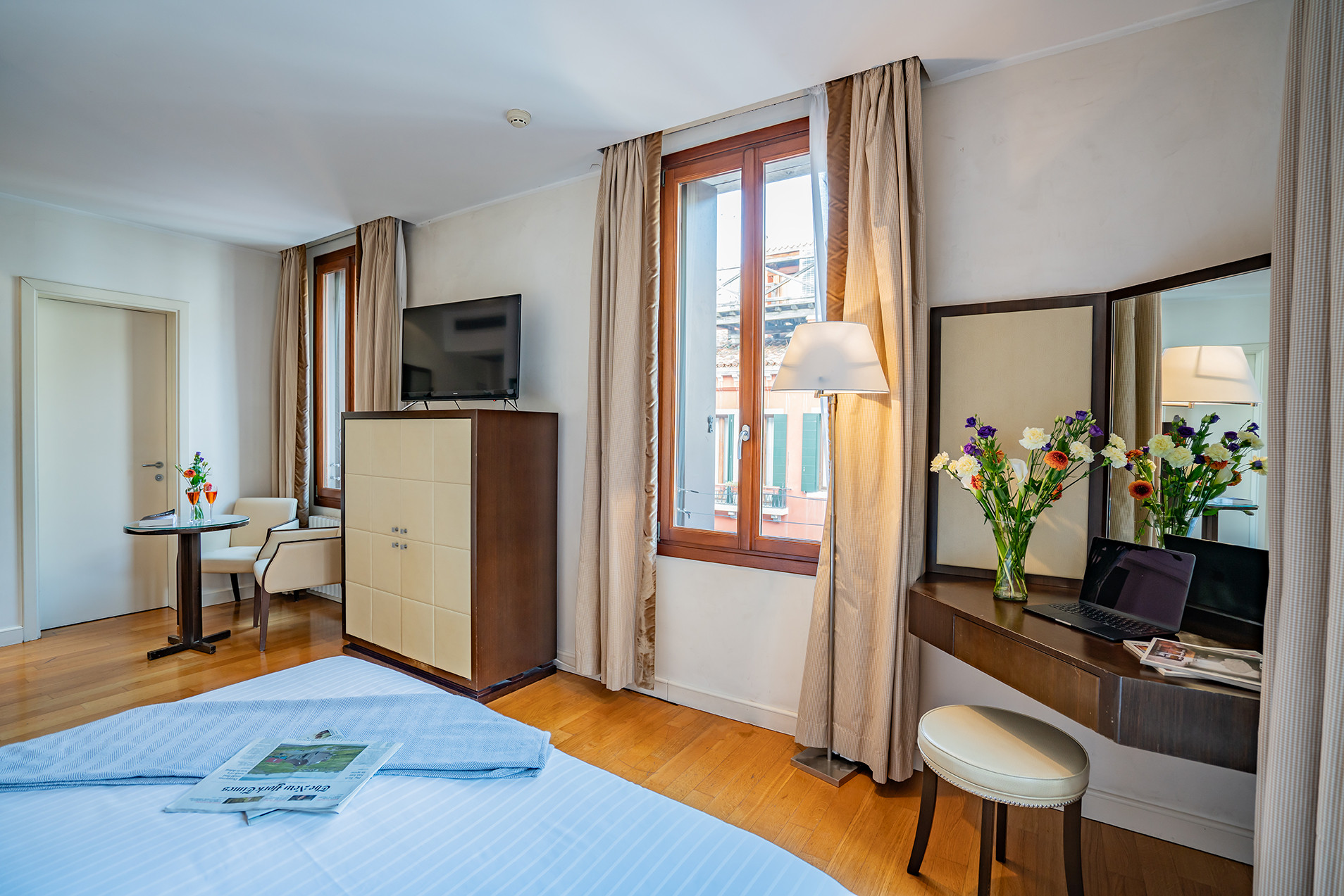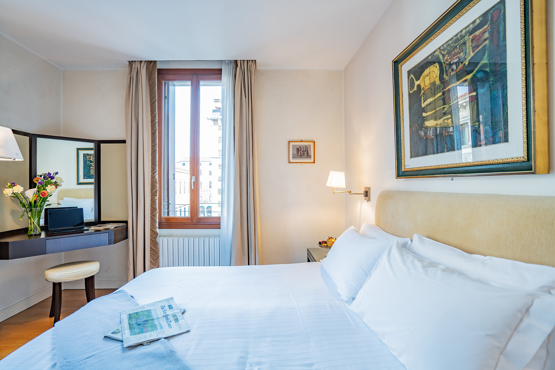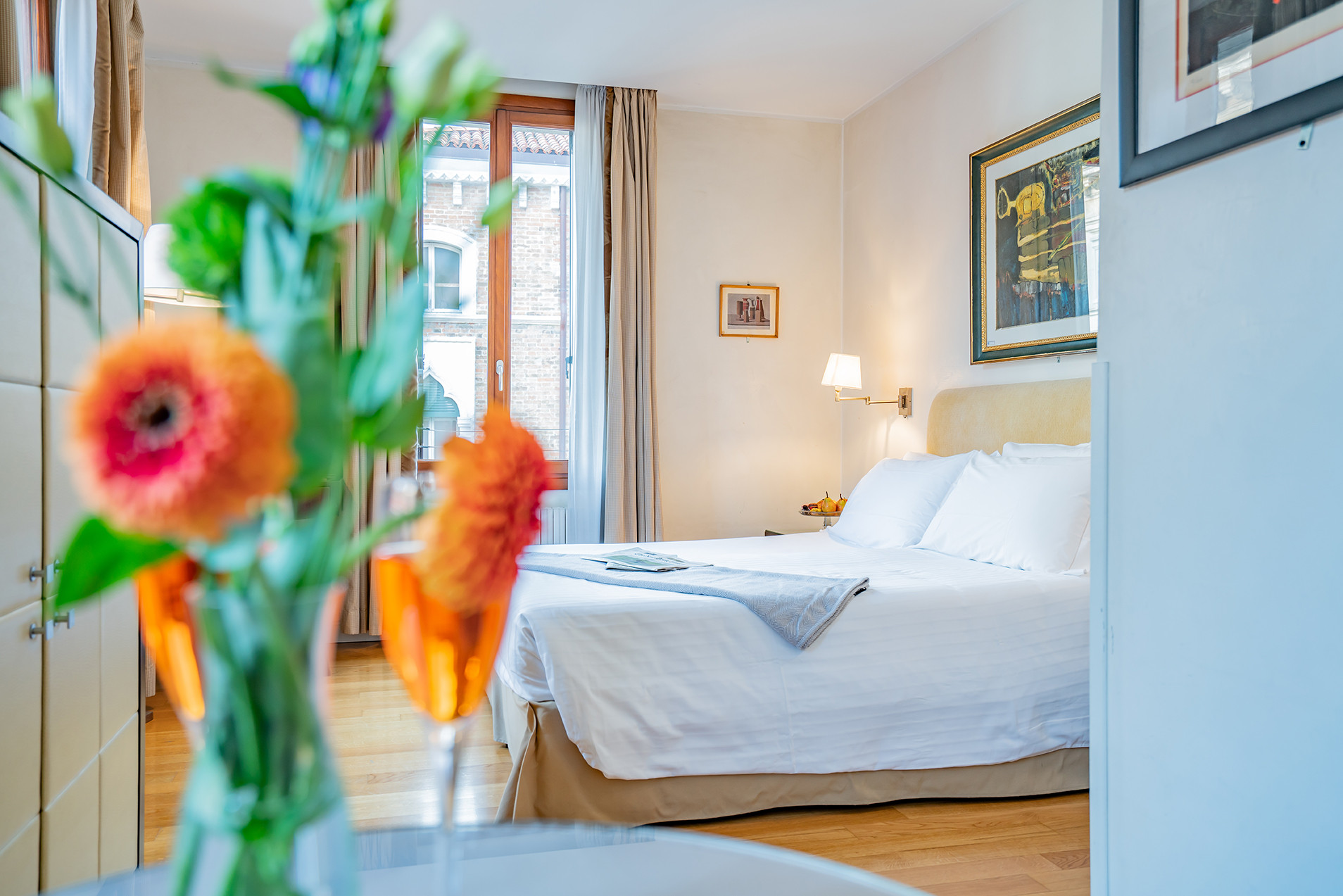 Double Canal View: larger rooms with panoramic canal views, ideal for guests who want to fully enjoy the city’s magic and watch gondolas pass under their windows.